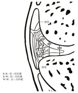 半月板的血供由边缘到中心部位是逐渐变化的,血管从边缘进人,因此半月板周边部分有最充足的血液供应,而中心部分几乎没有血供。对血供分布区域的描述有助于对半月板撕裂后的康复提供指导。最外周的区域为红-红区域(图46-1),大约占半月板的外侧 25%,这部分的血供最为丰富。红-白区域位于半月板外周有血供区和中心无血供区的交界处,白-白区域是指半月板中心无血供区。红-红区域损伤后愈合的可能性最大,因为那里的血供最好。红-白区域损伤后有可能愈合,而白-白区域损伤后几乎不可能愈合。