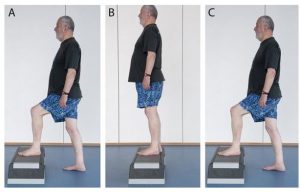 增加下肢肌力、平衡与本体感觉。患侧置于一个相对低平、稳定的踏板上,健侧慢慢离开地面,将重心移动到患侧并伸直患侧膝关节。随后缓慢下落还原。过程中时刻保持髋、膝、踝对线。踏板高度从8~25cm根据实际情况选择。每组10~15次,每天两组。