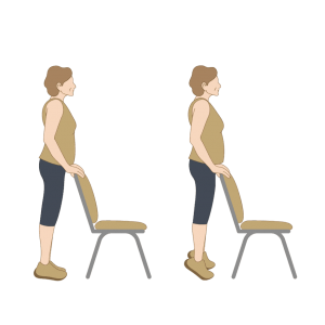 站立于椅子前方,屈曲患侧下肢缓慢下蹲,直到臀部触碰到椅子,随后站起还原。整个过程中不要完全坐在椅子上。根据实际力量,可手持负重。每组5~10次,每天3组。