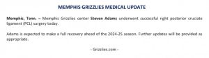 今日灰熊官方宣布,亚当斯已成功接受了右后十字韧带修复手s。亚当斯本赛季已报销。灰熊官方表示他预计会在2024-25赛季前完全康复。
