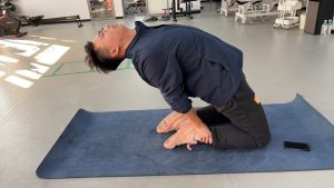 动作要领:双膝跪地,小腿脚背贴地,臀部向后做与脚后跟上,身体前倾使胸部贴住大腿,放松腰背肌肉,缓解肌肉僵硬。