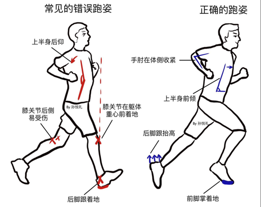 左图是常见跑步的错误姿势,可以看到当前侧腿的后脚跟着地时,会因为重心的问题导致许多额外的力施加在膝关节上,长期以来就会感到膝关节后侧酸痛,对膝关节造成损伤。