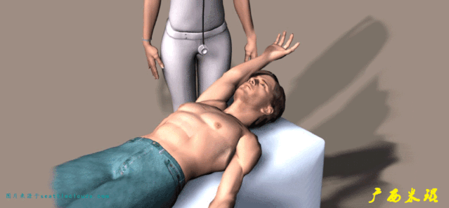 (2)Anterior drawer test: 也称为肩关节前抽屉试验,一只手固定肩峰,一只手推动肱骨头向前来检查活动度。