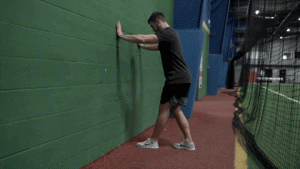 身体呈向前弓箭步的姿势站在墙前,前脚离墙约10厘米,慢慢屈膝,感受小腿感受小腿后方和踝关节的伸展。