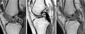 C:急性撕裂,以ACL纤维增厚和水肿性改变为特征,显示信号强度增加(白色箭头)。纤维仍保持连续性,提示前交叉韧带部分撕裂。