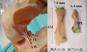 偶尔在这两个束之间有一个额外的中间束[2,3]。整个ACL的长度约为38 mm,宽度约为11 mm[4]。前内侧束长38.5±3m,后外侧束长19.7±2mm.两束大小相似,平均宽度为5.0±0.7 mm,中间物质[5]的宽度为5.3±0.7 mm.