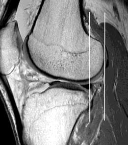 如图所示,胫骨平移的前移,可测量平行于图片框架的两条线(白线)之间的距离。在股骨外侧髁的正中矢状面上,通过胫骨外侧平台的最后角画一条线,第二条线与股骨外侧髁的最后面相切。胫骨前移位5-7mm提示前十字韧带撕裂,大于7mm可诊断为前交叉断裂。