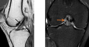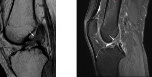 如图所示,前交叉韧带(ACL)部分撕裂的矢状位成像,前交叉韧带松弛张力消失,外观凹陷(白色箭头),信号强度增加。然而,纤维仍然是连续的,提示部分前交叉韧带撕裂。