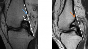 2:画一条与后交叉韧带后缘相切的线(白线),如果该切线在其远端5cm内不与股骨后侧相交,则认为PCL线为正;如图1所示,前叉连续性异常时,后交叉切斜明显股骨后侧相交(蓝色箭头位置),图2则会有一定距离(橘色箭头位置)。