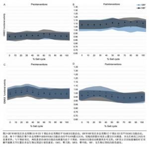 对照组和干预组在人体测量学和报告的基线结果测量方面没有显著差异(表1)。所有最初分配到组的人完成了所有研究时间点(见补充图S1[在线提供])。无论分组分配如何,与基线测量(图1A和2)相比,在整个步态周期中GMED功能活动比增加了具有统计学意义的时间主效应,相应的效应量较大(P < .01,平均差异:0。13-0.21,Hedge’sg:0.97-1.89),而GMAX测量值在不同的时间点上没有显著差异(图1B)。当比较两组之间在两个时间点的GMAX和GMED功能活动比率时,在整个步态周期中,两种肌肉的时间交互作用没有统计学意义(图1C和1D)。