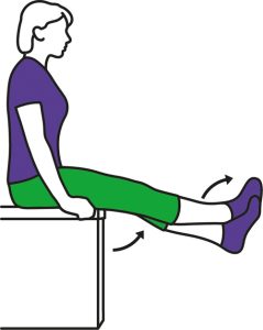 端坐在椅子上,身体前移,腰部挺直,双手放于大腿前方;抬起右腿,尽量屈曲膝关节,然后伸直腿,脚尖上翘,保持膝关节伸直状态3秒后放下;做10次后换对侧腿做相同动作。每条腿做20次。